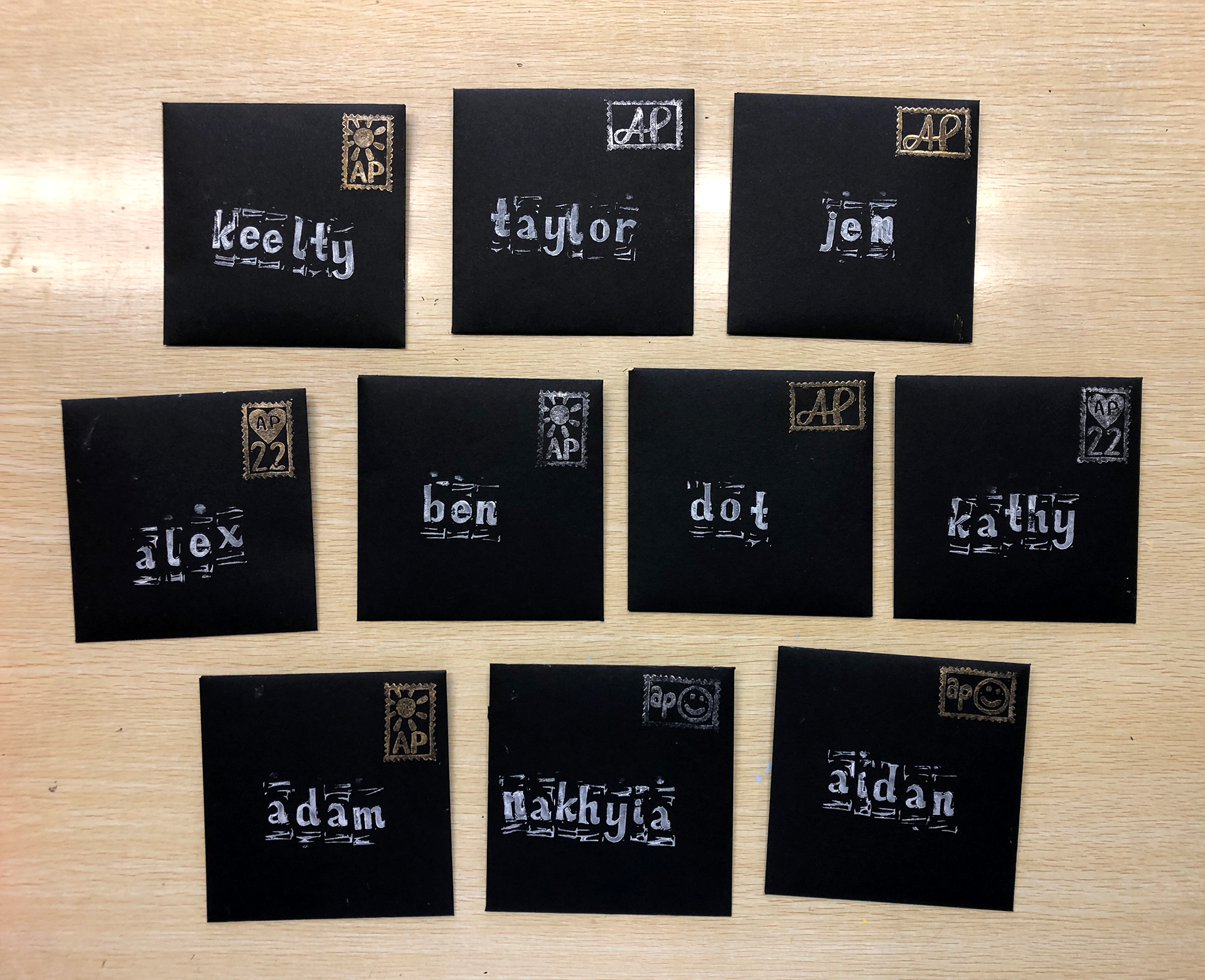 For “Letters” I wanted to share letters; Both in the form of post and in the form of characters. Each envelope is handmade, and the postage stamps are specially designed for this class. I designed the lowercase alphabet to be a friendly and open sans serif. Then I carved them from easy cut blocks and mass printed them using many colorful stamp pads. The paper I printed on was lightly tea stained to varying degrees. I wanted the letters to resemble the feeling of playing scrabble in the family room, or rearranging the magnetic letters on the fridge in the kitchen. There is something familiar about “Letters,” something like a memory of home.